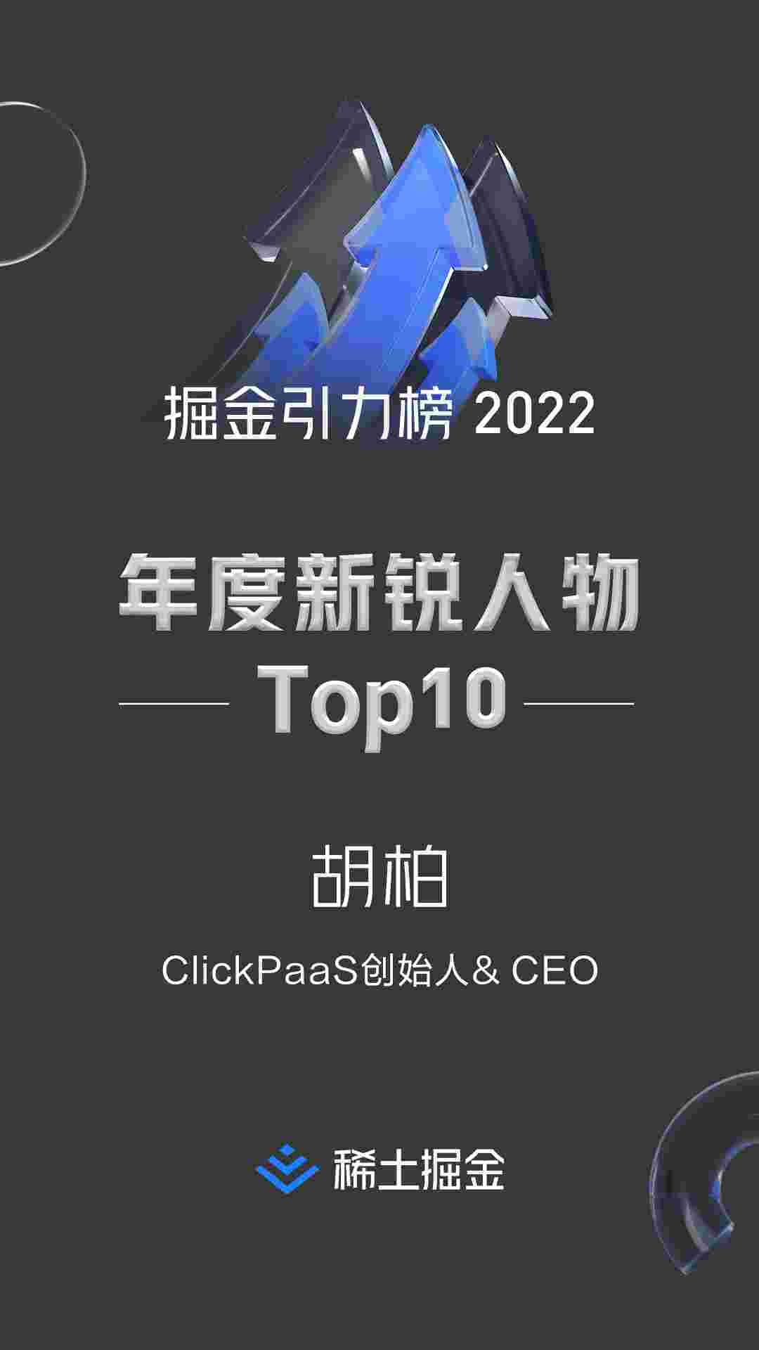 2022年1月6日,,稀土掘金社区第一届「掘金未来大会」成功举办,,,,会上发布了“2022 稀土掘金引力榜 年度新锐人物”榜单,,,上海爱湃斯科技有限公司(简称小米钱包)创始人及CEO胡柏实力入选年度新锐人物TOP 10。。。